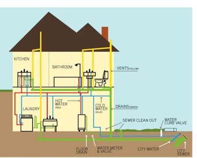 This diagram shows many of the common types of vents and drains in most homes. The green pipes represent outgoing wastewater, the yellow pipes represent ventilation tubes, the red pipes indicate hot water, and the blue lines show cold water.